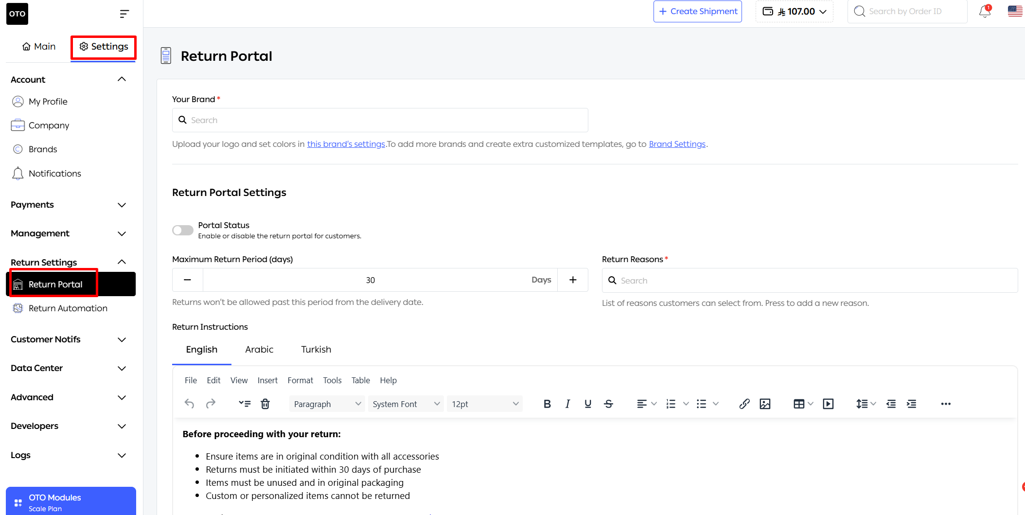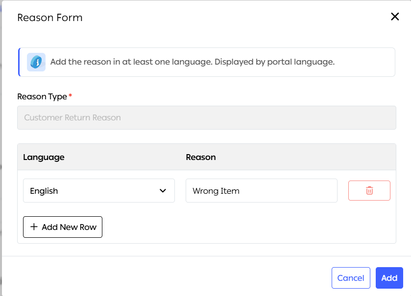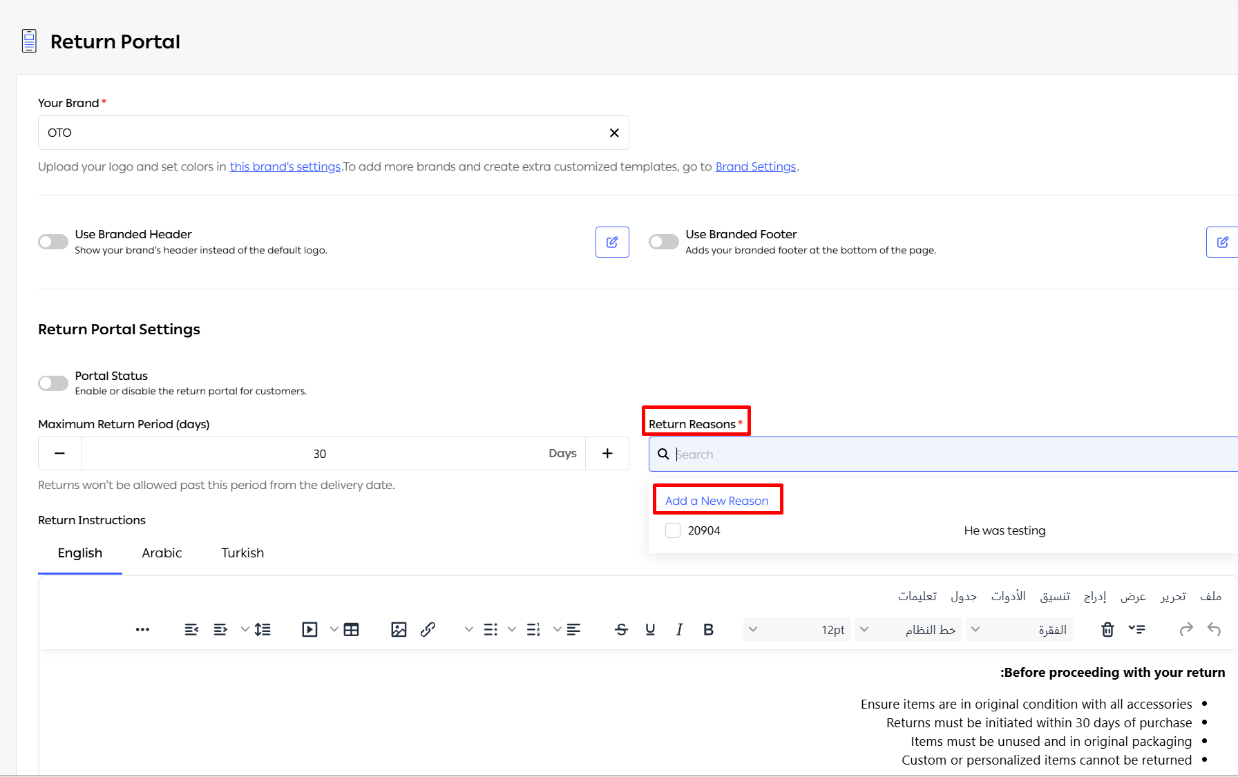 Return Reasons: You can create a list of reasons (e.g., "Wrong Item," "Damaged," "Changed Mind"). These can be localized into multiple languages including English, Arabic, and Turkish.