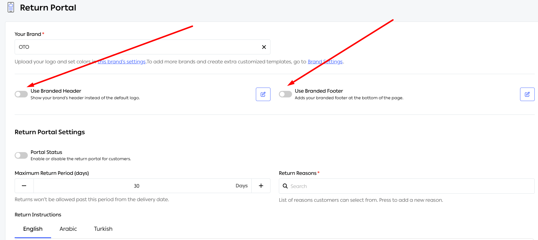 Once the brand details are set, you can customize the portal's behavior under Settings > Return Settings > Return Portal.
